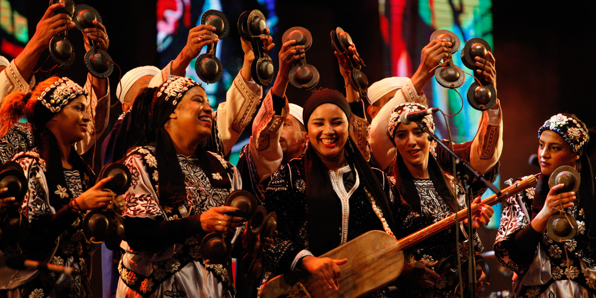 In this vein, the main event of the second day of the festival was a collaboration between the inimitable Malian singer Fatoumata Diawara and 20-year old Asma Hamzaoui, one of the very few women publicly performing Gnawa music. The Casablanca-born Hamzaoui fronts an all-female band of kouyous called Bnat Tombouctou (Daughters of Timbuktu), whose name clearly draws the oft-drawn link between Gnawa and Mali. She is often lauded as the first female guembri player but, according to her, the innovation is more her public stature than her being a Gnawi: “It’s not really that strange. It was not really very common … but a long time ago, women used to play the instrument.” Her father, Maalem Rachid Hamzaoui, began to teach her the guembri at the age of 7. Thirteen years later, she’s headlining the Gnawa Festival.