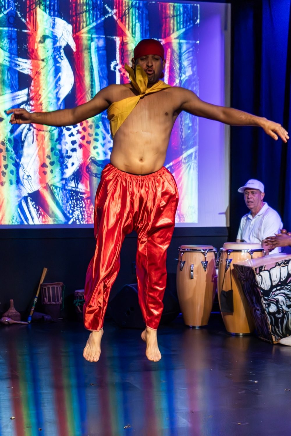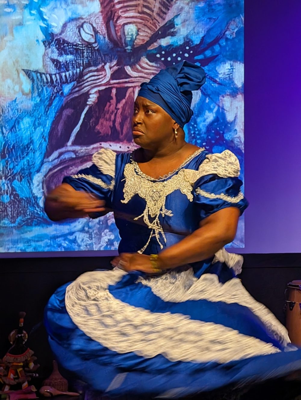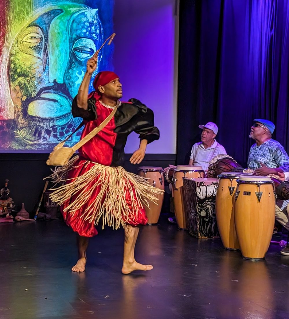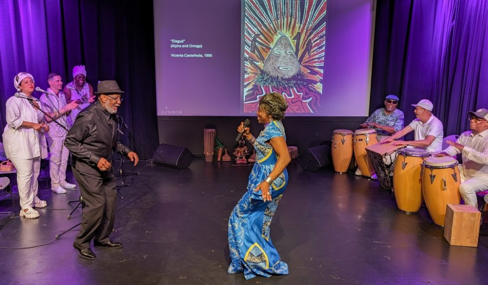These artists formed the core of the music and dance ensemble that performed this year in Holyoke, Massachusetts, and in Old Lyme, Connecticut. Afropop Worldwide caught their performance at the Media Center in Holyoke. This is the chamber music of Afro-Caribbean tradition, featuring drumming as subtle and complex as anyone can imagine, vocals that crackle with precision and soar with spiritual passion and riveting dance spectacle. The songs and dancers evoked orishas, deities of Afro-Cuban religion associated with colors, elements and realms of human emotion and endeavor. The dance performances were enhanced by images of orisha paintings contributed by event organizer Ivor Miller, a cultural historian specializing in the African Diaspora in the Caribbean and the Americas, and a longtime friend of and contributor to Afropop Worldwide.