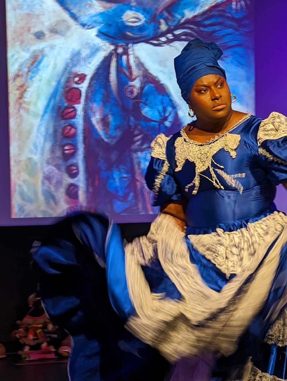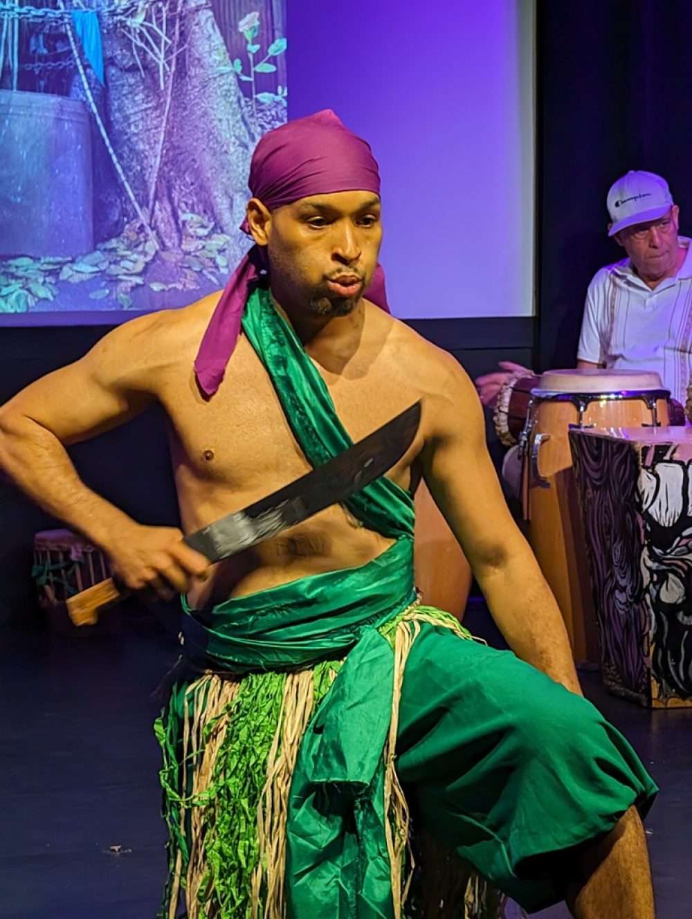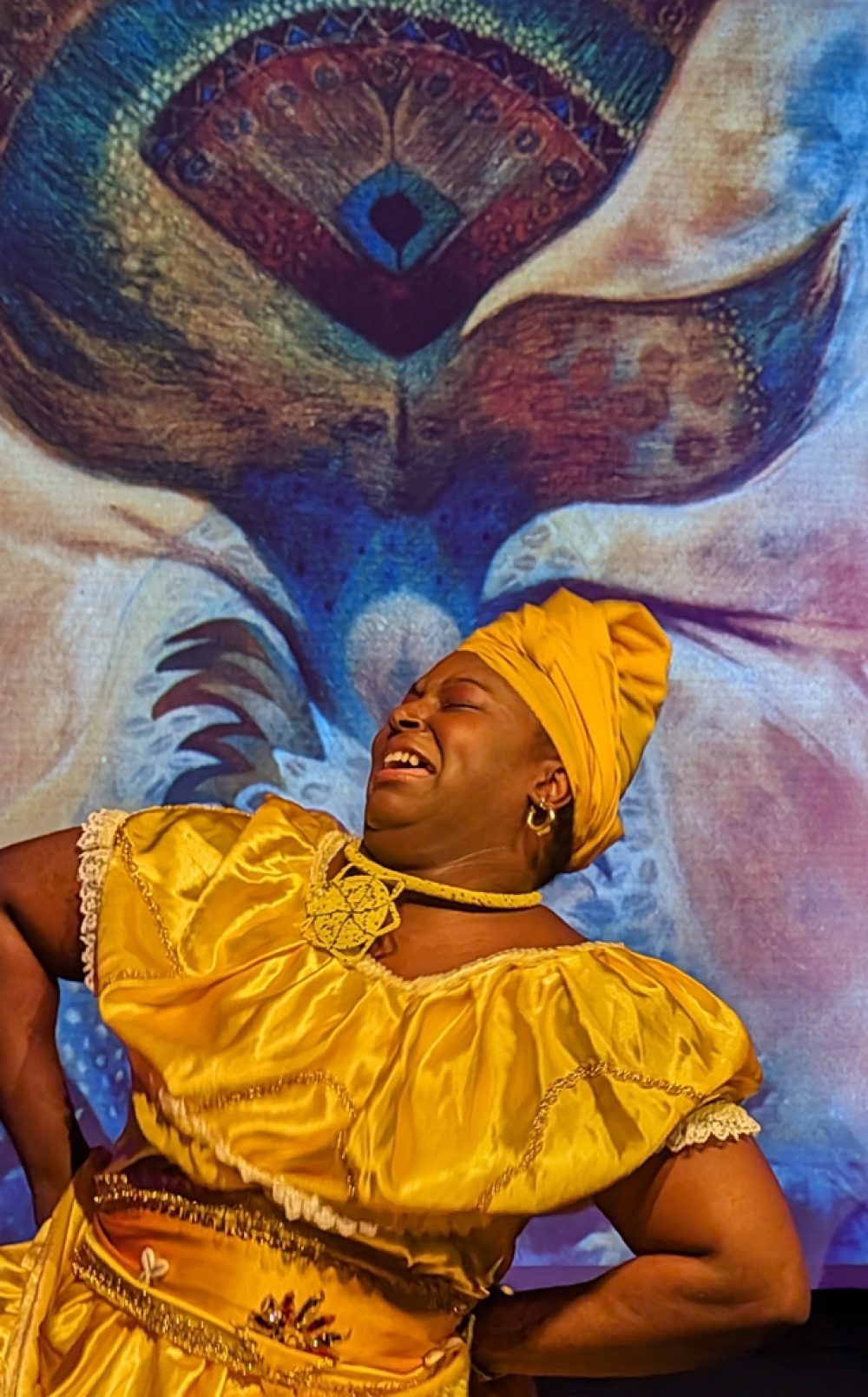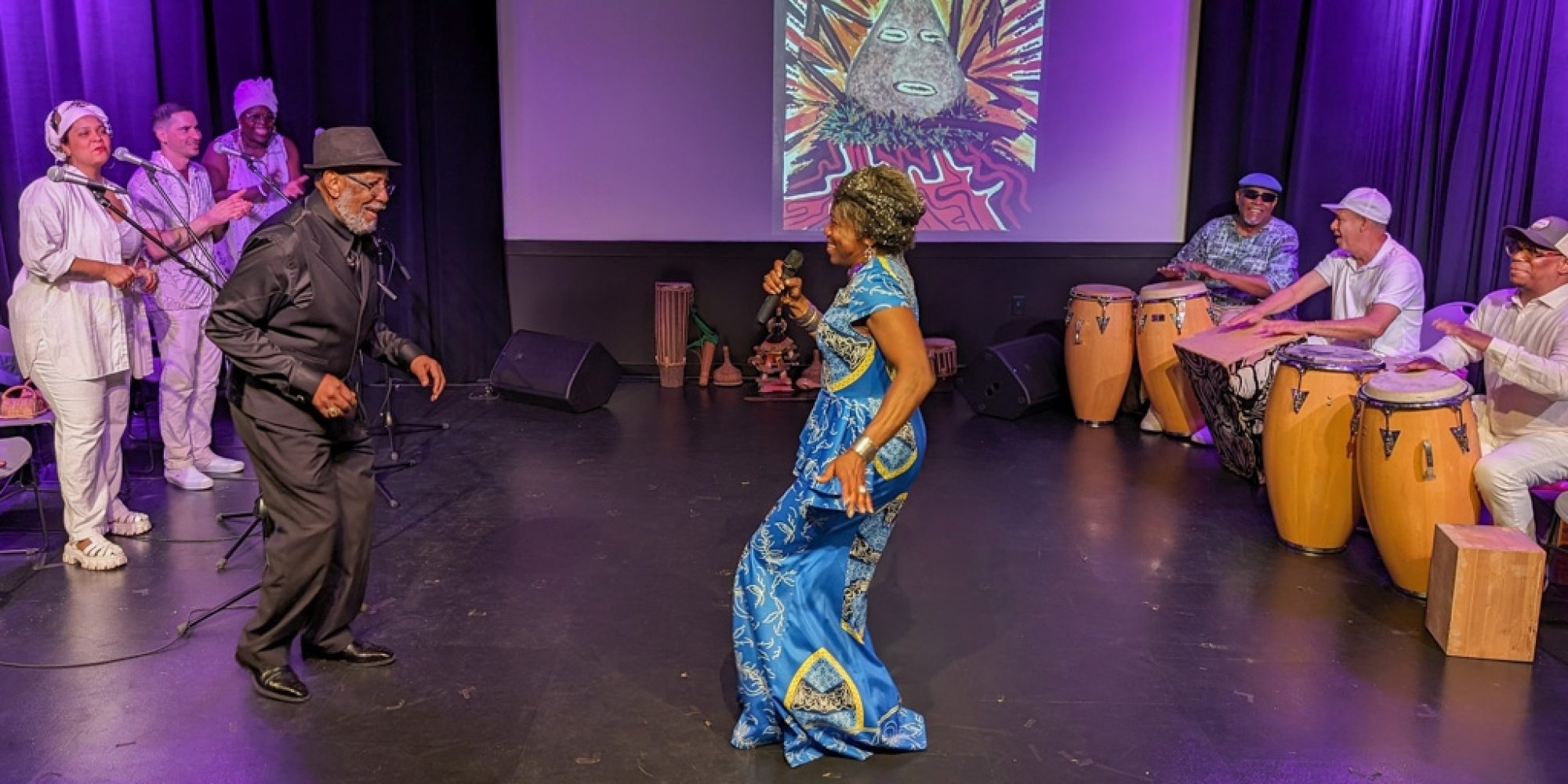 These artists formed the core of the music and dance ensemble that performed this year in Holyoke, Massachusetts, and in Old Lyme, Connecticut. Afropop Worldwide caught their performance at the Media Center in Holyoke. This is the chamber music of Afro-Caribbean tradition, featuring drumming as subtle and complex as anyone can imagine, vocals that crackle with precision and soar with spiritual passion and riveting dance spectacle. The songs and dancers evoked orishas, deities of Afro-Cuban religion associated with colors, elements and realms of human emotion and endeavor. The dance performances were enhanced by images of orisha paintings contributed by event organizer Ivor Miller, a cultural historian specializing in the African Diaspora in the Caribbean and the Americas, and a longtime friend of and contributor to Afropop Worldwide.