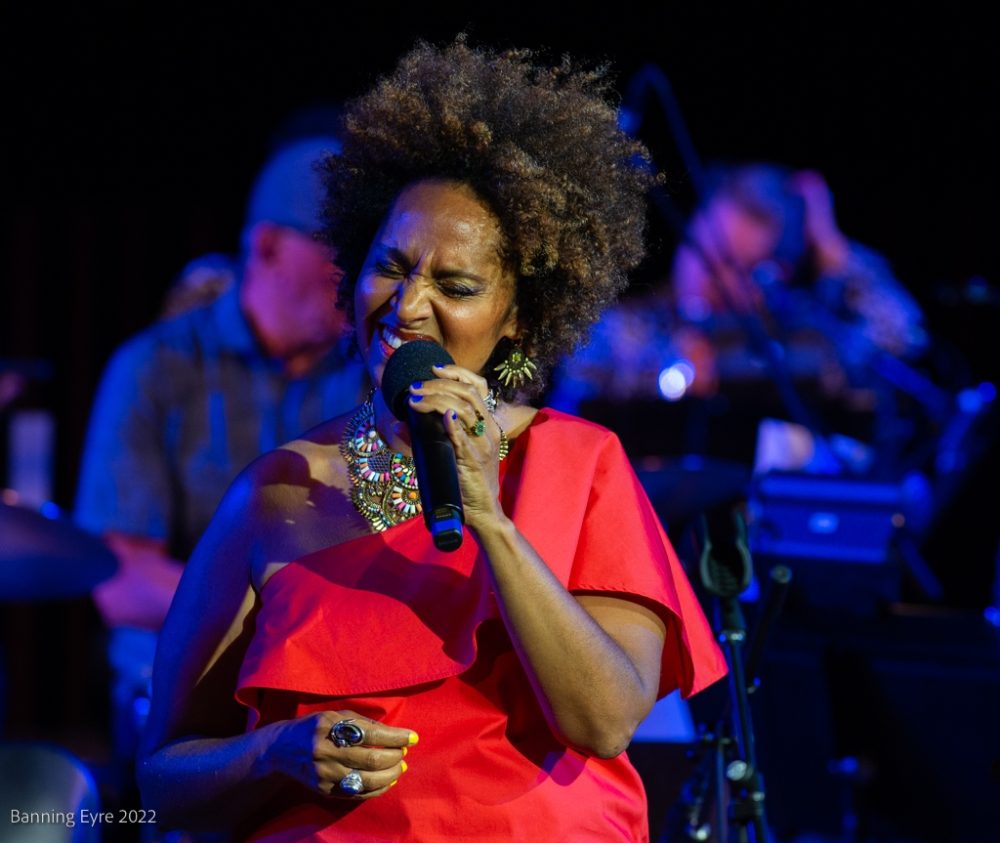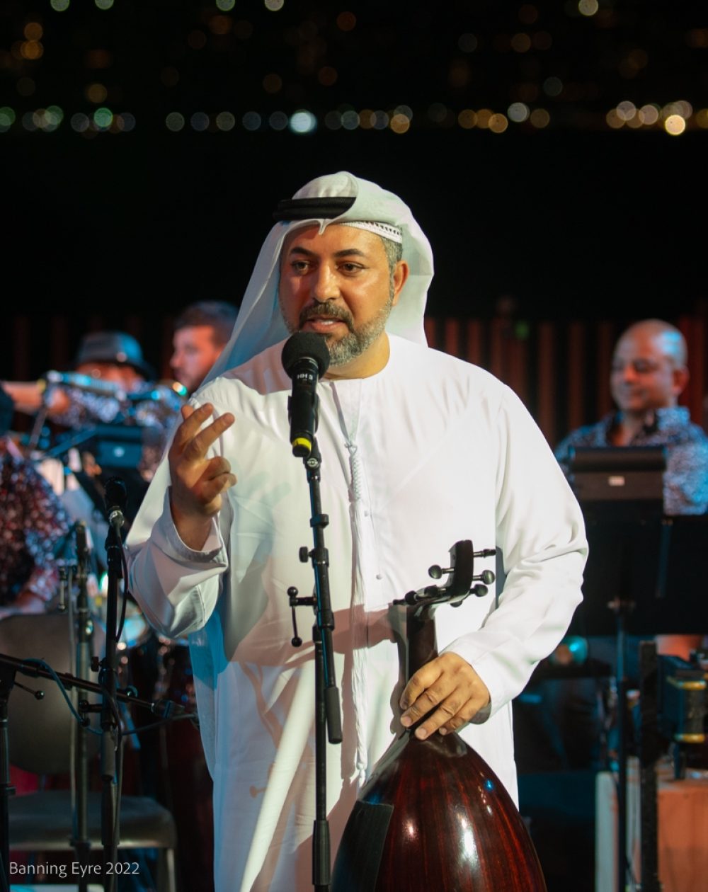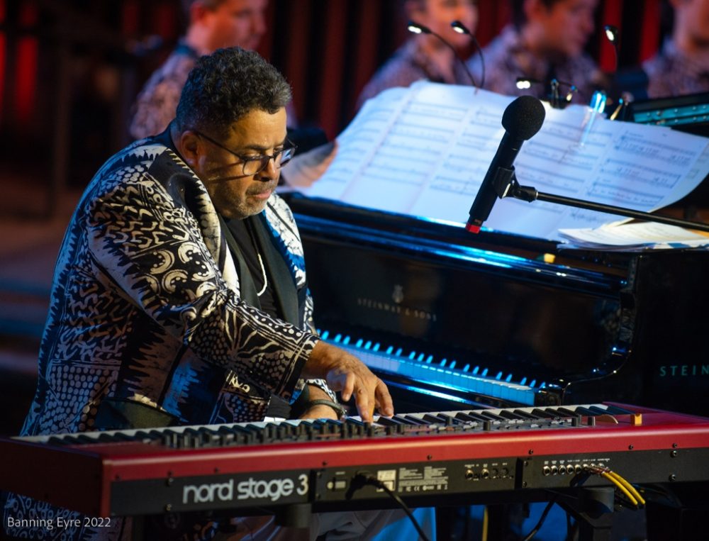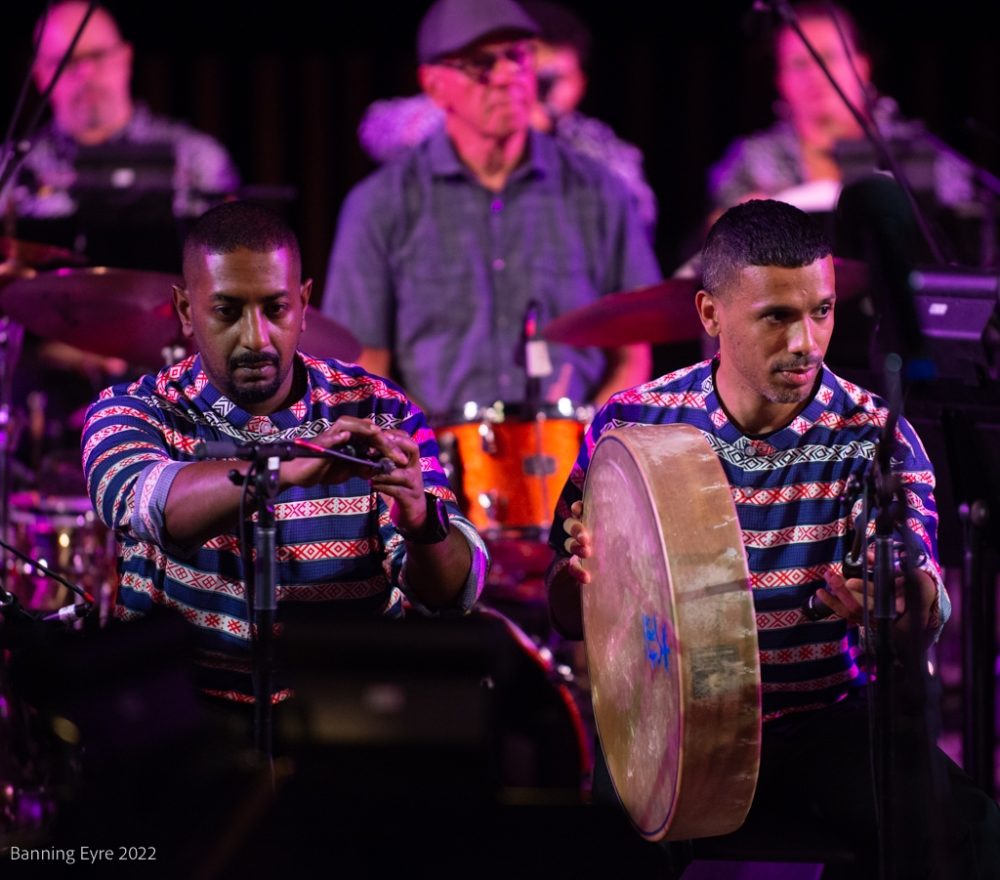 The show was spectacular, with O’Farill and his 17 musicians leaning hard into the khaleeji rhythms as the others took turns as featured artist. Ali Obaid’s oud melodies blended seamlessly into the orchestration, bursting forth at times for exquisite solos. Yazz Ahmed played trumpet and fluegelhorn through cosmic echo processing creating a gorgeous ambiance before launching into her own compositions. Malika Zarra, clearly a longtime collaborator with O’Farill, enjoyed the most playful interactions with him and showcased an impressive range of styles and vocal textures. The deepest music came with Al Mulaifi and the four percussionists of Boom.Diwan, showcasing pearl diving rhythms and melodies, and meshing with O’Farill’s Afro-Latin percussionists, all clearly enjoying themselves. All the artists came together for a spirited finale.
