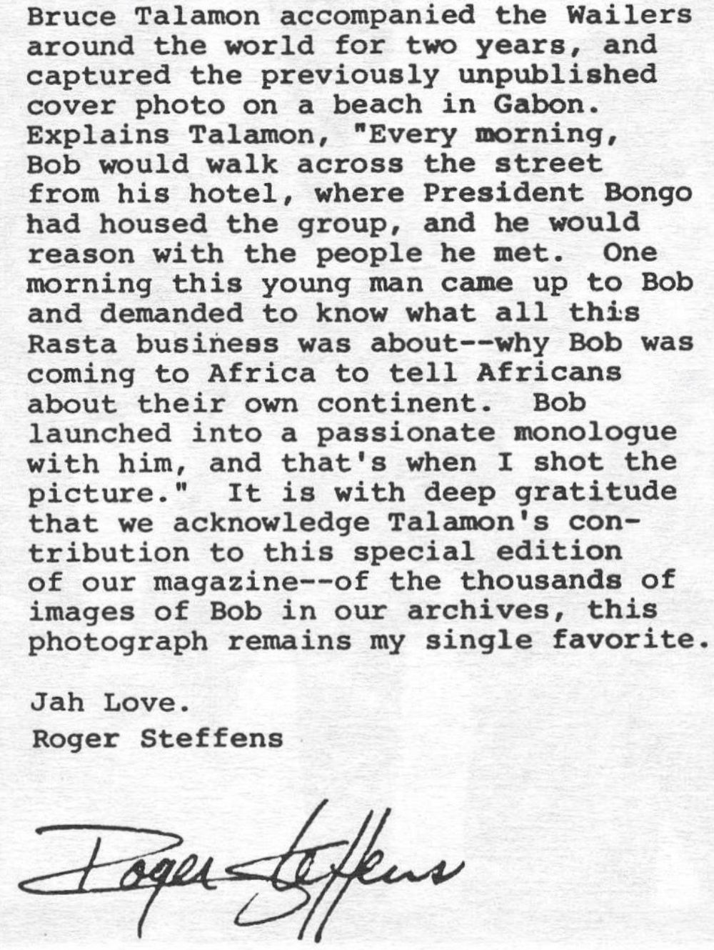 The cover photo by Bruce Talamon shows Marley reasoning with youths on the beach in Gabon, West Africa in 1980. As Steffens noted in the Forward: