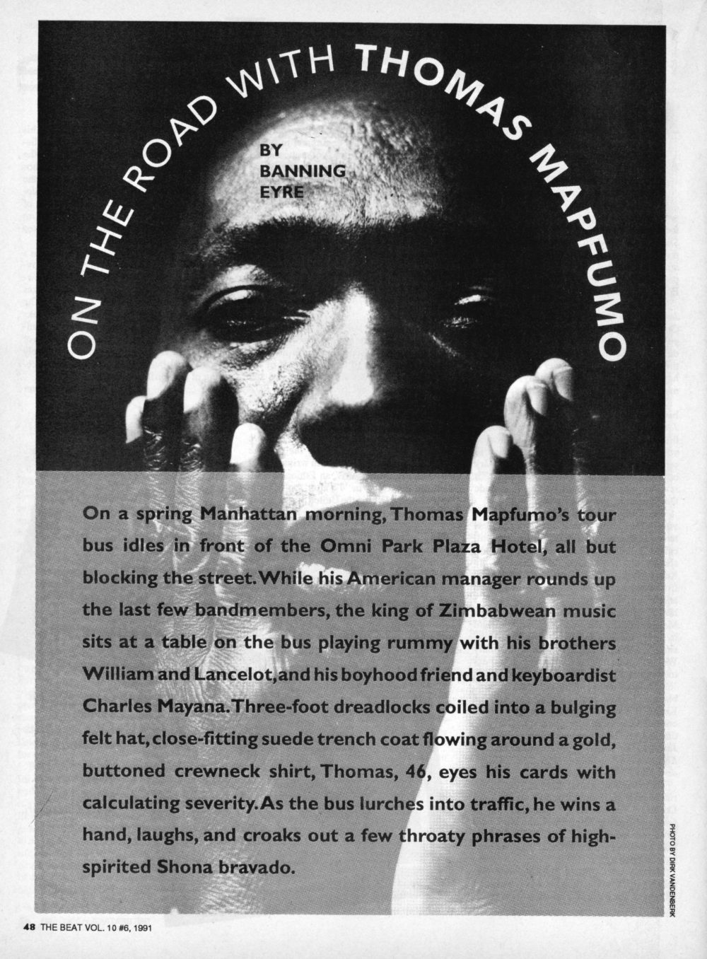 This installment of our “Best of The Beat” series takes us back in time with “On the Road With Thomas Mapfumo,” the story of Banning’s first encounters with Mukanya (Thomas’s Shona nickname), in Harare in 1988 (the year Afropop Worldwide was founded). He then relates the saga of his experiences going on the road with the Blacks Unlimited on their first U.S. tour in 1991, and offers intriguing first-person insights into the complicated character of Mapfumo, and a snapshot of the Blacks Unlimited at this early point in their career.