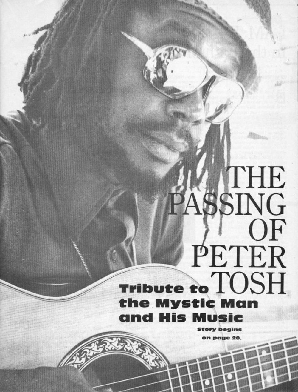 This issue of The Beat, Vol. 6#5, 1987, was ready to go to press when the shocking news came of Tosh’s death. Our phenomenal staff had to do in one week what would normally take one or two months for an average issue: find photos and prepare a tribute to one of the foremost figures in reggae. We published a follow-up issue in December with material that was received too late to make the October edition. BOTB will present this material in future posts.