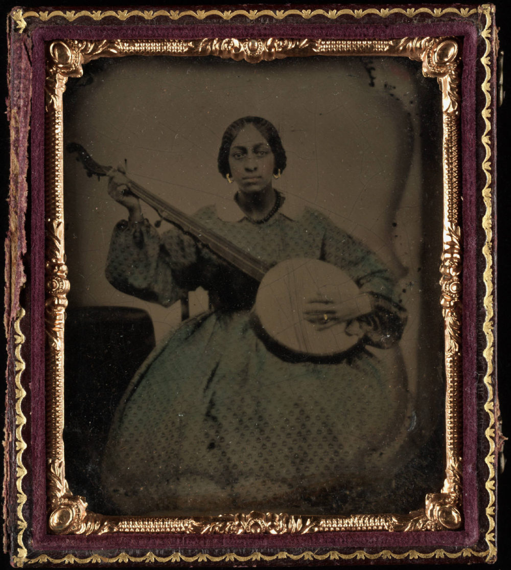 Leaping ahead, we have two images from around 1865, featuring the banjo taking on the shape that's familiar to us today. But if you look closely, strangeness starts to emerge. For example, this woman, in a photograph from Yale's Beinecke Library, is holding a nine-string banjo. And neither banjo has frets yet.