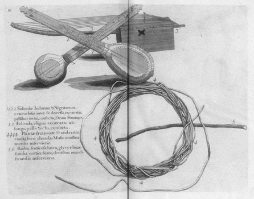This is one of the earliest existent accounts of the banjo in the Americas, courtesy of the Scots naturalist Sir Hans Sloane, who visited Jamaica in 1687 and published his book in 1707. Already, you can see the differences between these "strum strumps" and their West African cousins like the akonting and the ngoni: the banjo's flat fretboards and friction-based tuning pegs, borrowed from European instrument making. You can't see it in this drawing, but early banjos also had cultural and spiritual symbols on them, like cross-shaped sound holes on the side of the gourd's resonating body.