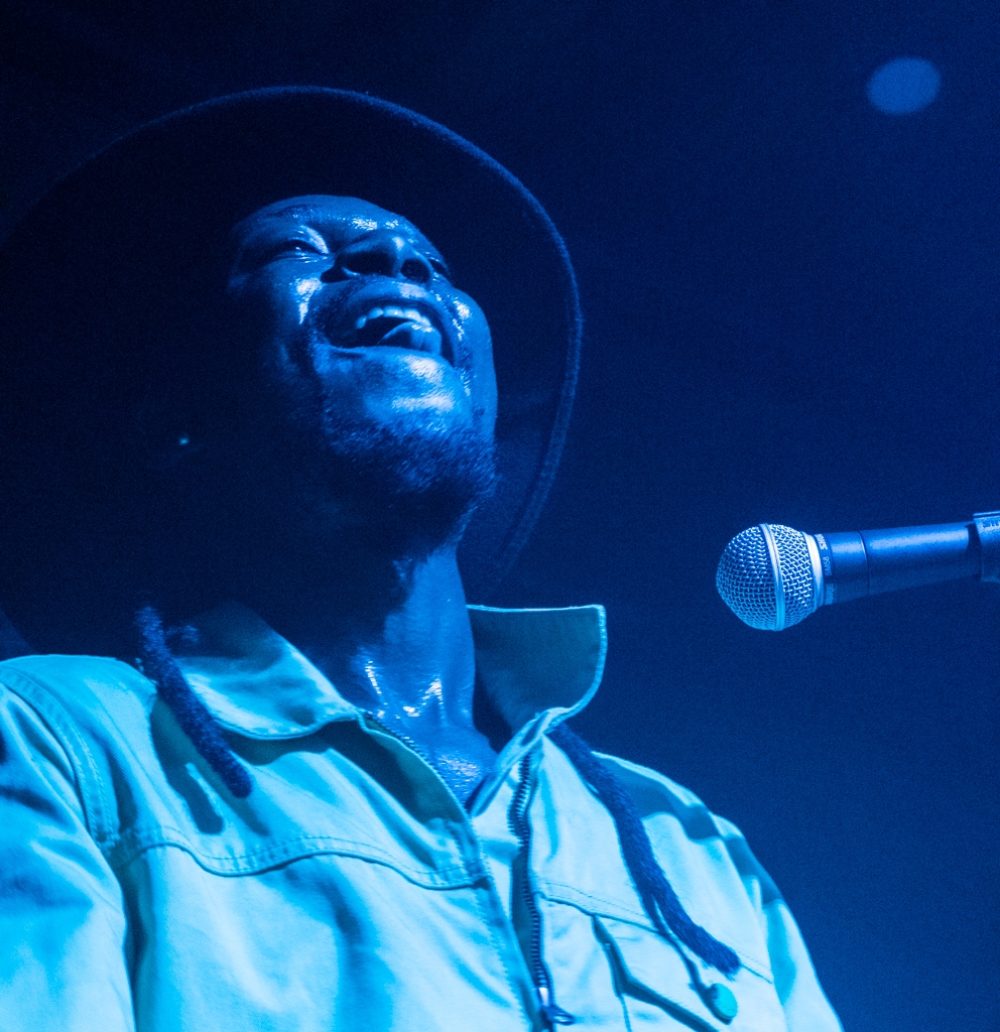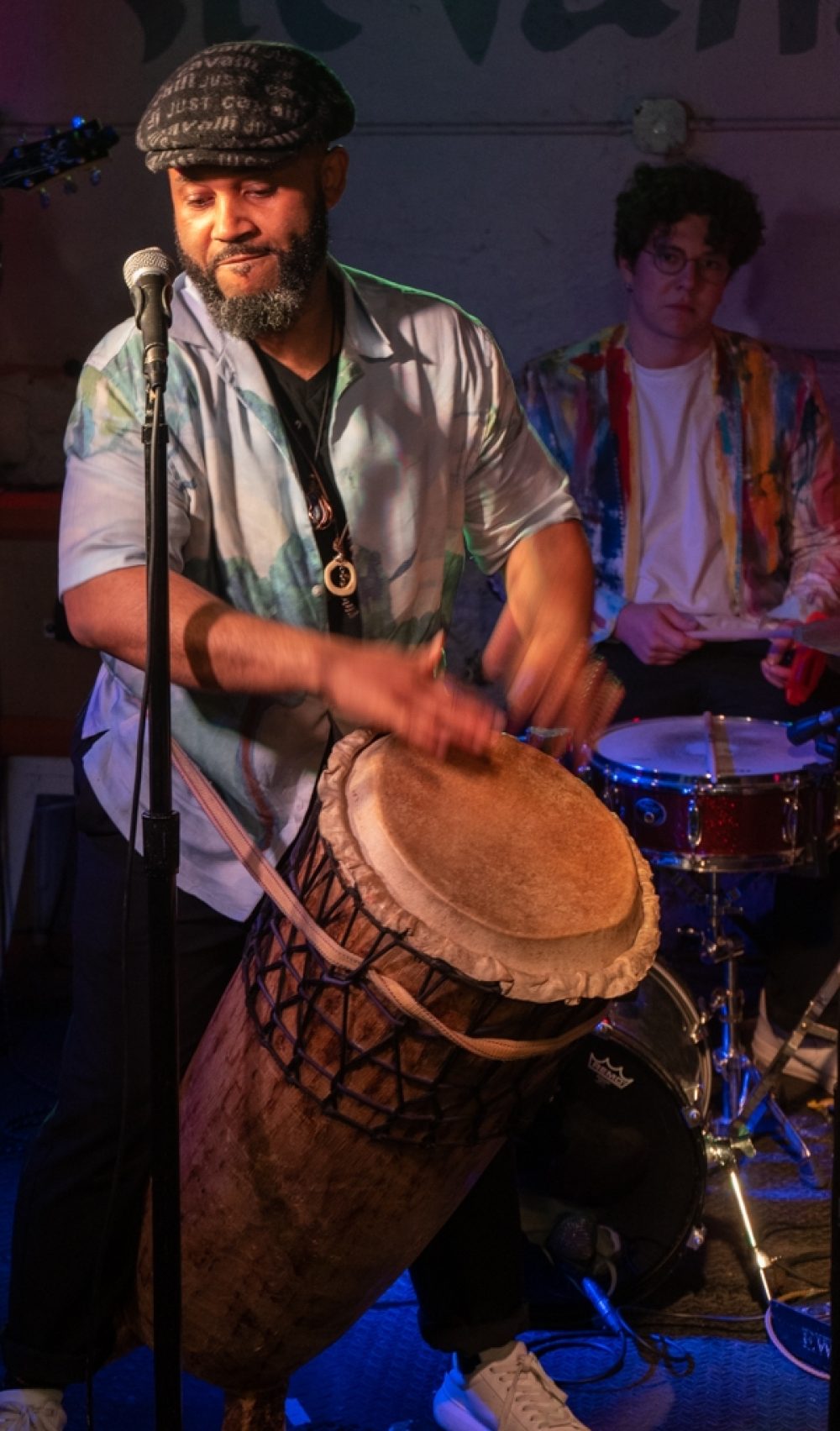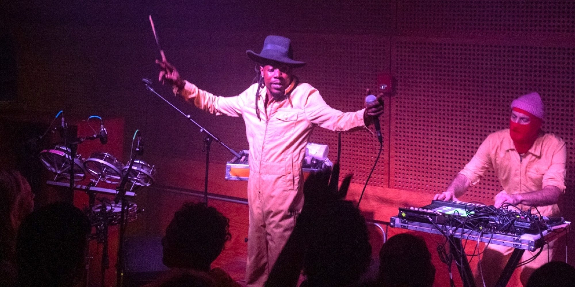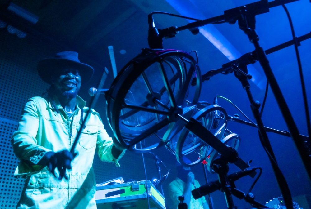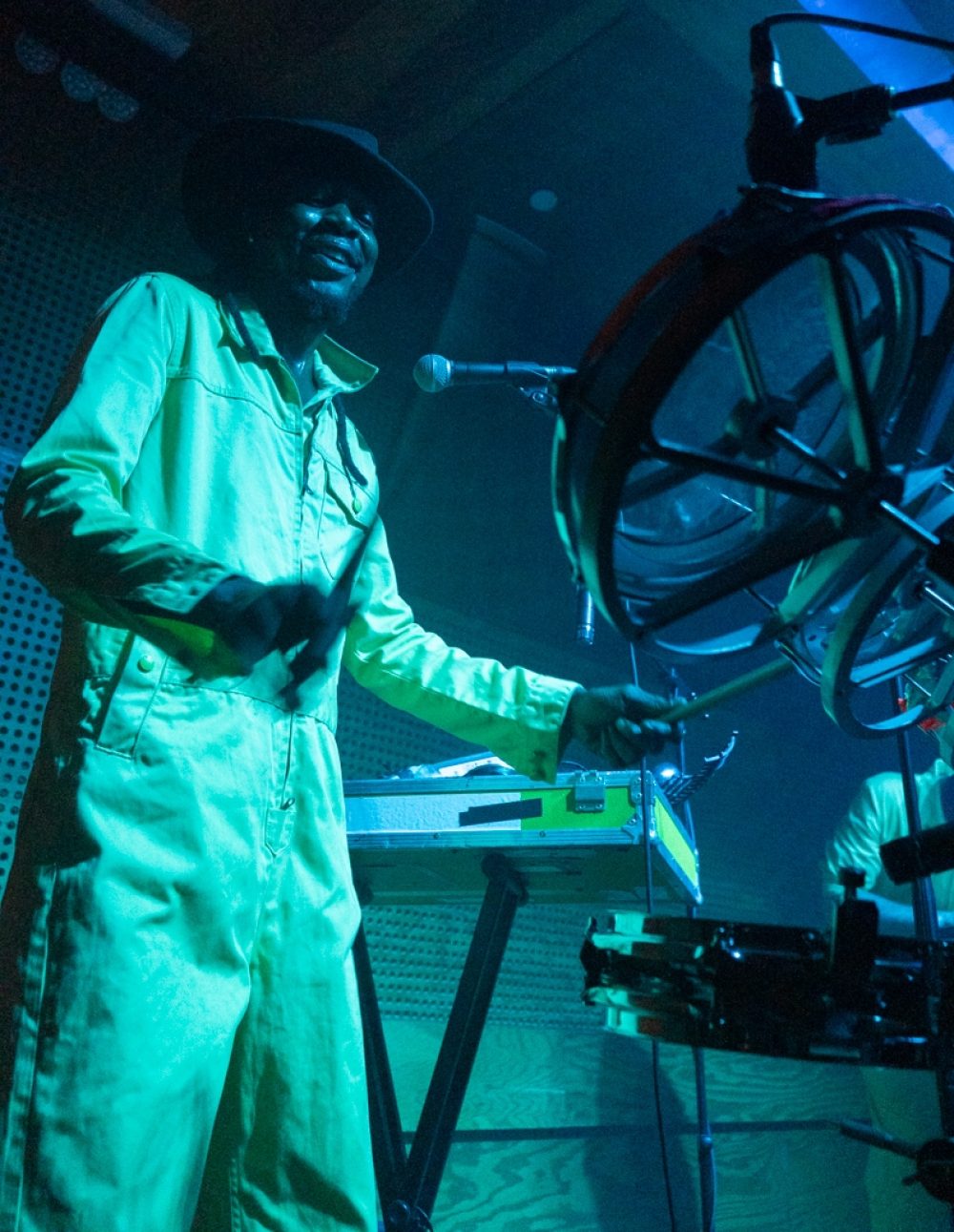 Folks who caught Kokoko at Le Poisson Rouge in 2019 were anticipating the full band lineup and were somewhat surprised when just two members, Débruit and percussionist/vocalist Julien Makara took the stage, minus most of those homemade instruments. Never mind. This full house of young Brooklyn denizens were ready to rumble, and rumble they did. Débruit’s rich sound scapes filled the air, and Makara absolutely delivered. He’s a superb vocalist, his tone at times reminiscent of Papa Wemba’s piercing tenor, and his melodies put an unmistakable Congolese stamp on the presentation no matter how otherworldly its direction veered. He mostly played a set of three mounted circular drums, and he played them almost like a melody instrument, not so much holding down grooves as making strong rhythmic statements.