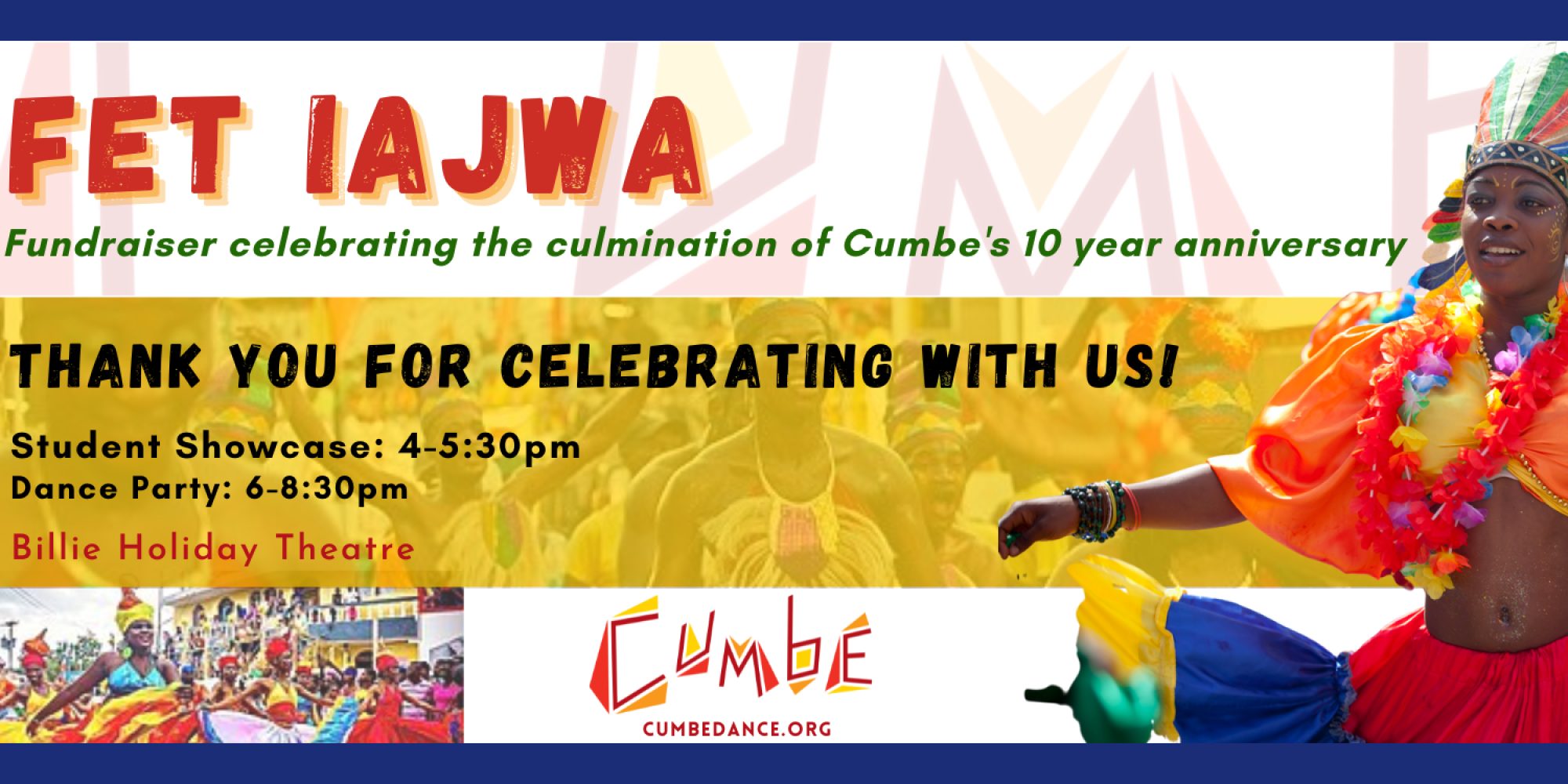 You could feel the ancestors alive and kicking at the Cumbé Center for African and diaspora’s recent Fet Iajwa celebration of their 10th anniversary. For one thing, the performances and follow-up dance party were held at the intimate Billie Holiday Theater. All praise to the great Lady Day! And then there were the artists, leading ensembles devoted to Brazilian, Cuban, Haitian, and African-American dance and music. These artists, and the ensembles of enthusiastic dance students they led, stood on the broad shoulders of their ancestors peering centuries back into the misty, sometimes troubled horizons of the deep past.