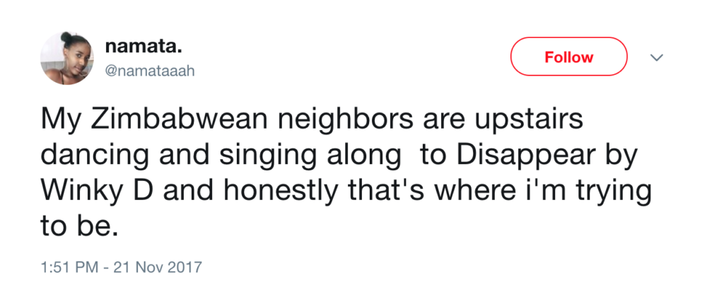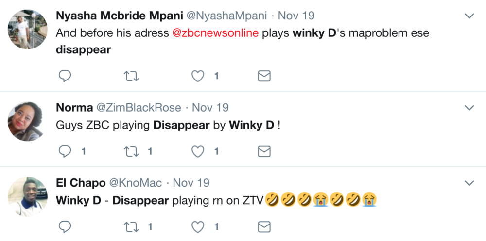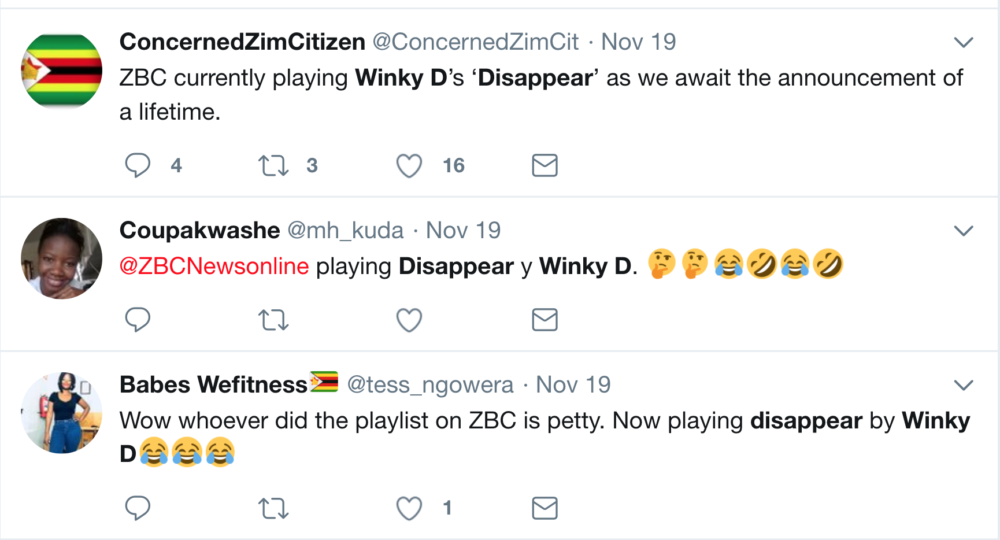 The world has been able to witness the unfolding of events at the start of the coup mainly on Twitter even when journalists were barred from entering the country. On Nov.19, the Zimbabwe Broadcasting Corporation (ZBC) aired Mugabe’s speech where he initially declined to resign and during this, tweets with the same song mentioned along with ZBC began to appear.