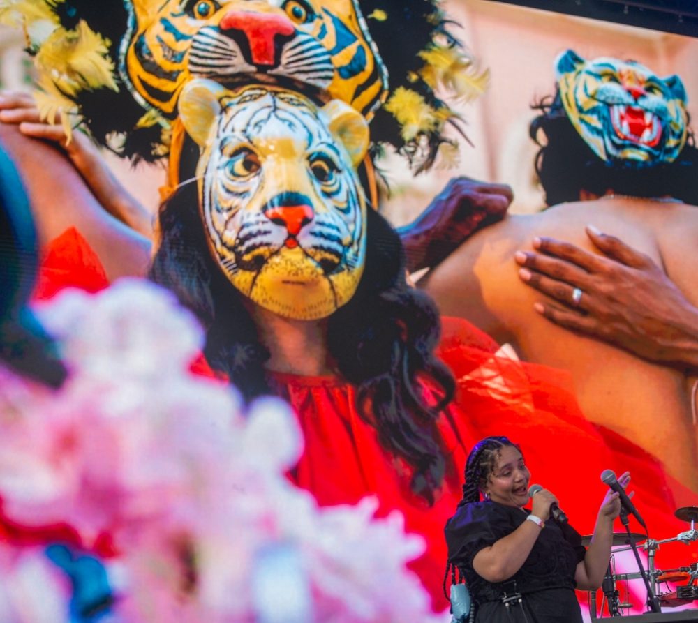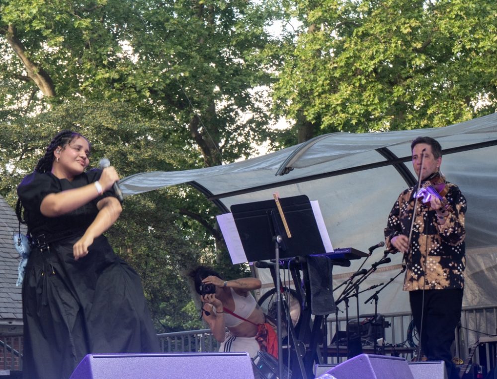On stage with just a versatile drummer and a fiddler, Pimienta carried the set with her robust vocals, and a few pointed words about the plight of immigrants in our time. The grooves were rich with African rhythms, and she had fans up front, clearly there just for her. For newcomers like us, equally arresting were the vivid visuals projected on the screen behind the performers, powerfully evoking Colombian beauty. As the music played, the breezes blew and the thermometer receded, the audience filled out, and the evening became Summerstage at its best, a Central Park blessing to end a grueling midtown summer day.