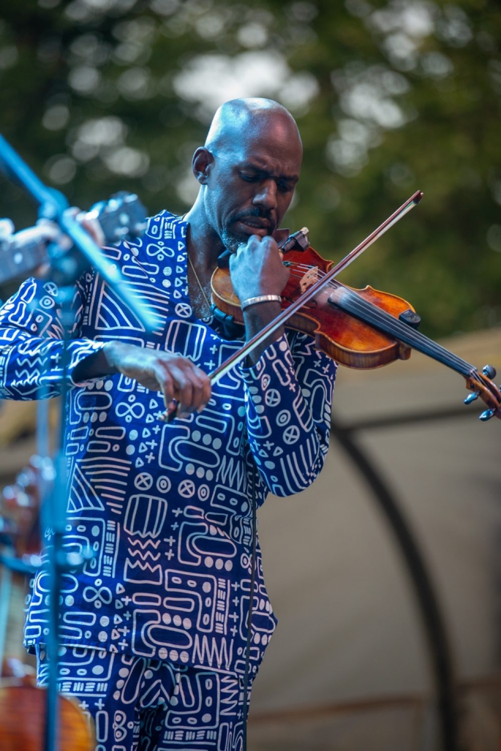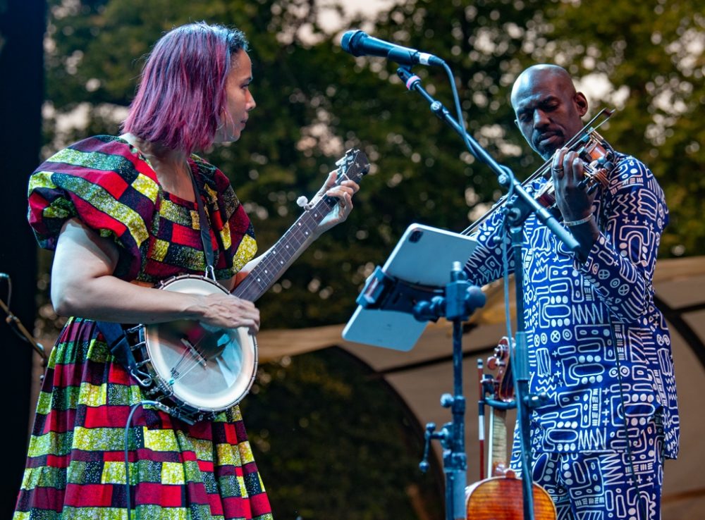 Then it was time for the Rhiannon Giddens Old Time Revue. Giddens opened with a nod to her home state, North Carolina, covering Elizabeth Cotton’s timeless song “Freight Train.” Accompanied only by her guitarist, she gave the old classic a soulful swing. From there, the ensemble grew, with ultimately six musicians on stage, including Giddens’s son and an alumnus of the Carolina Chocolate Drops, the band where Giddens got her start. There were ballads, dance numbers and a deep blues with Giddens on fretless banjo. It was about as countrified as Central Park gets, and the crowd was loving it.