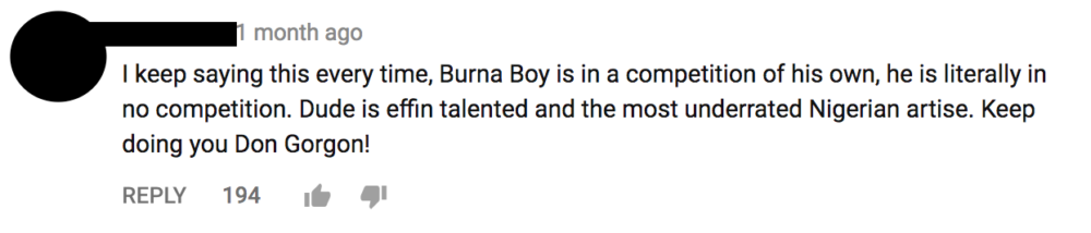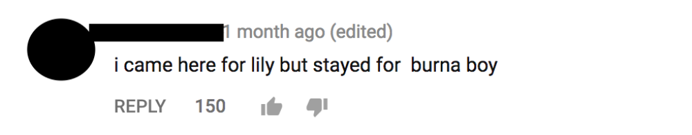 The video is like the song: It keeps moving and changing settings at a rapid pace so you can't take your eyes off it. Burna Boy is also not hard to look at, and he is phenomenal in this clip. As one of the comments remarked, Lily is the bigger name when it comes to the mainstream Western audience, so her fans will be pleasantly surprised to find they will be hooked on Burna Boy by the end of the song. Burna Boy's willingness to experiment with new sounds, his commanding voice, and Nigerian hipster-boy image sets him apart from other Nigerian Afrobeats stars.
