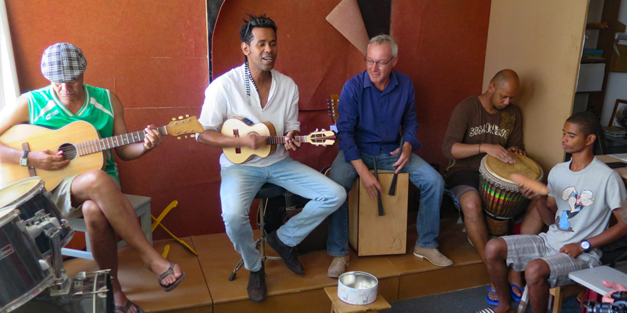 Instrument-building studio of the late Mestre Baptista in Mindelo. The Baptista family includes many great musicians, among them Cesaria's musical director, Bau, and the current proprietor of the workshop, Luis Baptista. (BE)