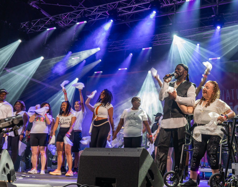 It depends on the show. Today it's two dancers, one on my right, one on my left, me in the middle. I have a pianist, I have a drummer, I have a bassist, I have a guitarist, I have three backing singers and then I have a percussionist. That's the group that will be on stage, so there are about 12 of us. I think that for what I do it's just right, but in Africa, when we play in stadiums, in larger spaces and then there are the means to have more people. There we have much more than that, that is to say that I have four dancers, often even more. I have a second pianist, I have three percussionists. So it depends on the setting.