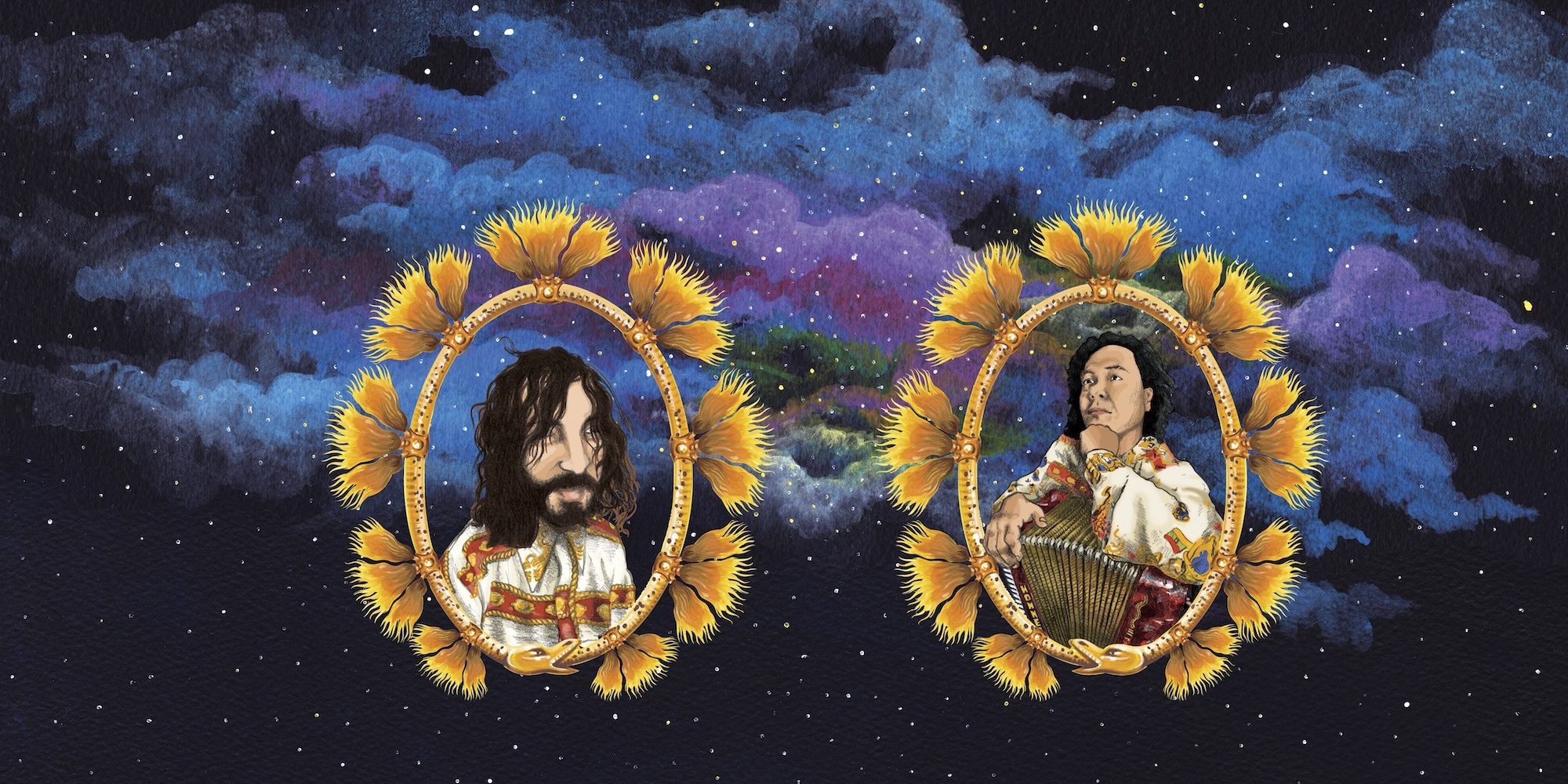 From the first moments of the Meridian Brothers’ new album, Paz En La Tierra, you can hear that something is different. The band—which is just Colombian musician Eblis Álvarez unless playing live—has teamed up with Conjunto Media Luna’s Iván Medellín for the new album. Centered on Medellín’s accordion, the resulting album draws heavily from traditional vallenato, an Afro-Indian-European music from Colombia’s Caribbean coast. Fans of outre-cumbia are treated to the folkier forebear of the ‘60s-and-onward cumbia canon Alvarez usually sounds like he’s drawing from. Colombian merengue (not to be confused with Dominican merengue) and other Caribbean forms like son are all fed into the Medellín-Álvarez machine. But even though hand percussion and accordion have replaced the dubby swells, nasally synths and programmed drums that characterize Álvarez’s work with both the Meridian Brothers and Frente Cumbiero, Paz En La Tierra’s songs still look forward to an anxious future. It may be in the shape of Colombian paseo, but the song “La Conquista de Outros Planetas” is actually about space colonists conquering other planets. Out today on Bongo Joe Records, Paz En La Tierra is, both at first glance and twelfth glance, a kinda weird left turn by Meridian Brothers. But then, their formula starts with ear-worming micromelodies, anchored by headbobbing basslines and then is washed over in weird left turns. Paz En La Tierra has an abundance of all three.