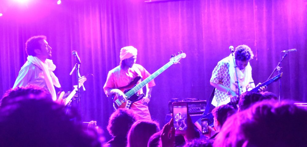 Presented by World Music Institute, Bombino was backed by Group Bombino, a quintet of two guitars, synthesizer (and occasional keyar), bass and drums. A typical Bombino song is in a swinging meter, driven by a back beat that occasionally skews to reggae. At several points in the night Bombino would be soloing as his backing band slowly and steadily built tension, until finally with the crack of the snare, it felt like a storm was breaking and the band sped off in euphoria, Bombino’s fingers becoming a blur.
