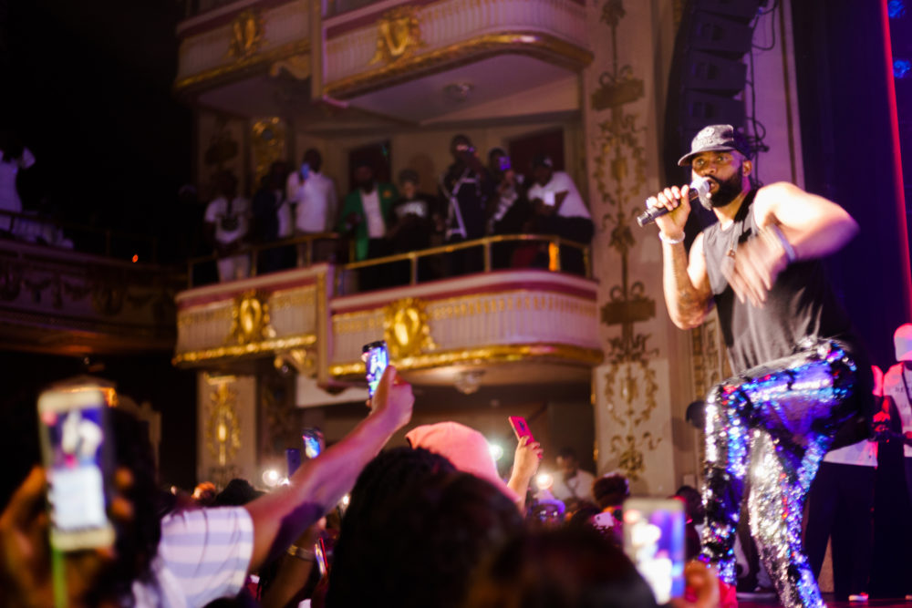 The Congolese superstar Fally Ipupa strides on stage at the Apollo Theater, dressed in a glittering silver suit and flanked by three singers in white. The expectant crowd explodes in a flash of elevated cellphone videography and screams.