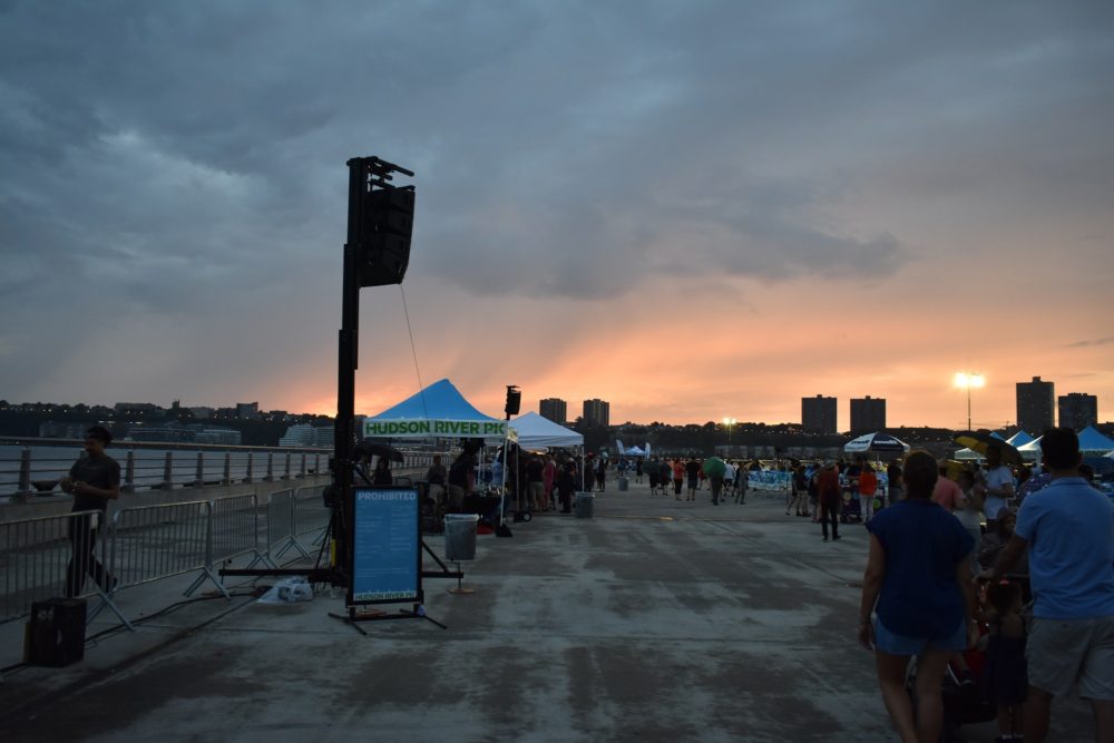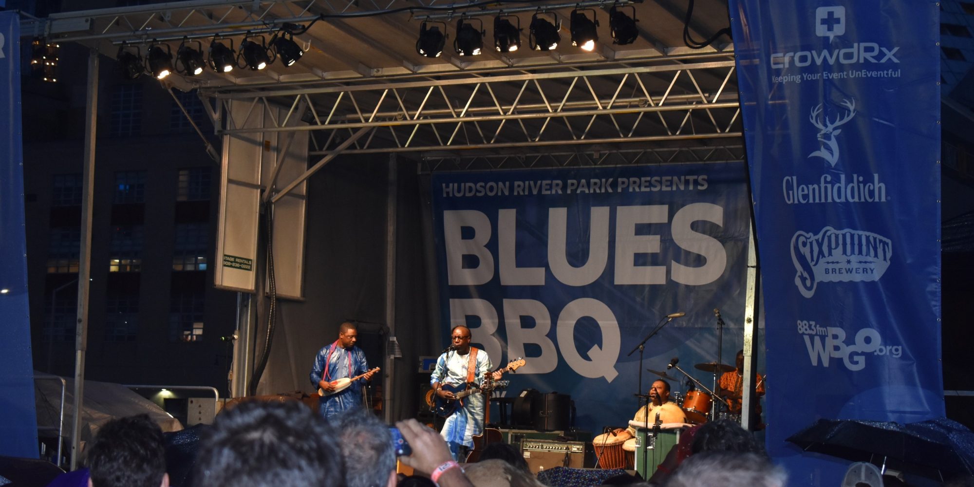 It was a matter of bad timing. As the previous band wrapped up, the rain that had threatened all day finally broke. With only one act to go, and no shelter to be found on the pier jutting into the Hudson River, people streamed towards the exit. Maybe they knew the rain would last only a moment, or maybe their check had already cleared, but Vieux Farka Toure and his band steadily set up as the rain went from mist to big, cold drops. The BBQ tents were coming down, beer service closed. There was only one reason to stay, and they were still soundchecking.