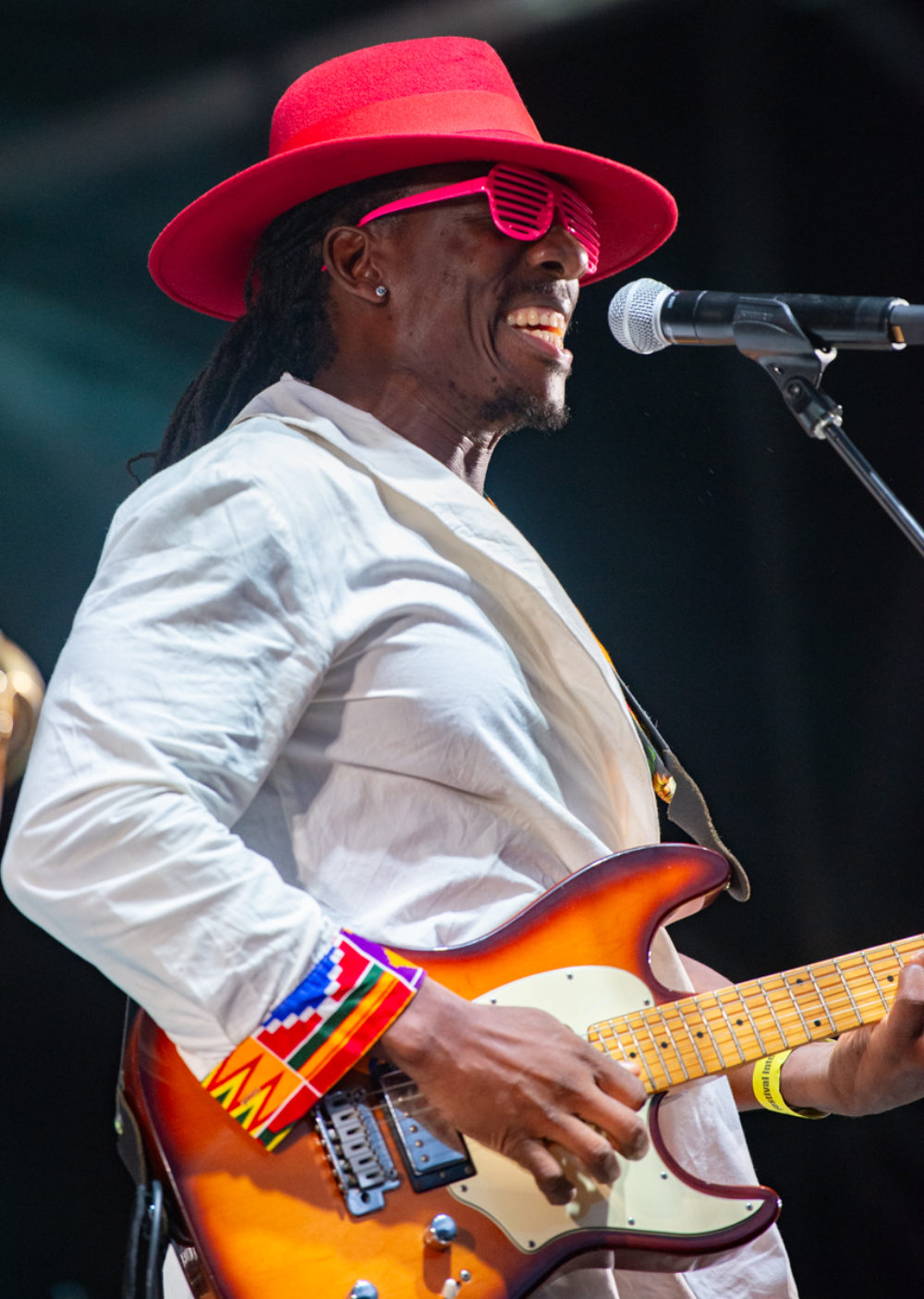 The trumpet is played by Togolese trumpeter called Kokou Damawou. I think you saw him on stage with us. He’s a really good trumpet player and on the “Lanmou Nou” song, it's a kind of twoubadou with banjo and maracas and all that mixed together with guitar and make a unique sound. We didn't put any electronics on it. We put a kick at the end, and also the trombone solo alternating with the trumpet solo.