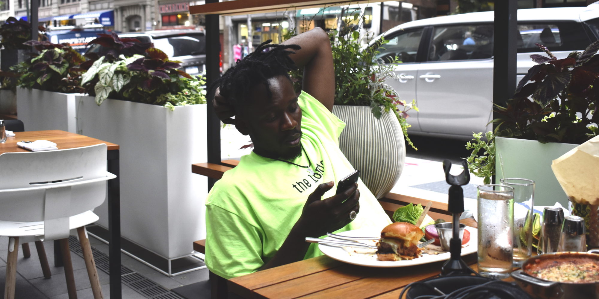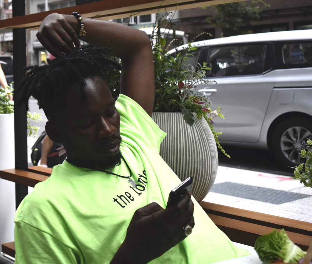 If I didn't know that Mr Eazi was a star before we sat down, I probably would've figured it out when the wide-eyed waitress came by to greet him by name. But I'm sure I would've figured it out when she came back to say that Eazi could get his hamburger and dessert for free if he mentioned the burger in the interview, only for Eazi to counteroffer that he'd also need $50,000 to do it. I didn't see a check, so I'll just say the interview took place in Manhattan and leave it at that.