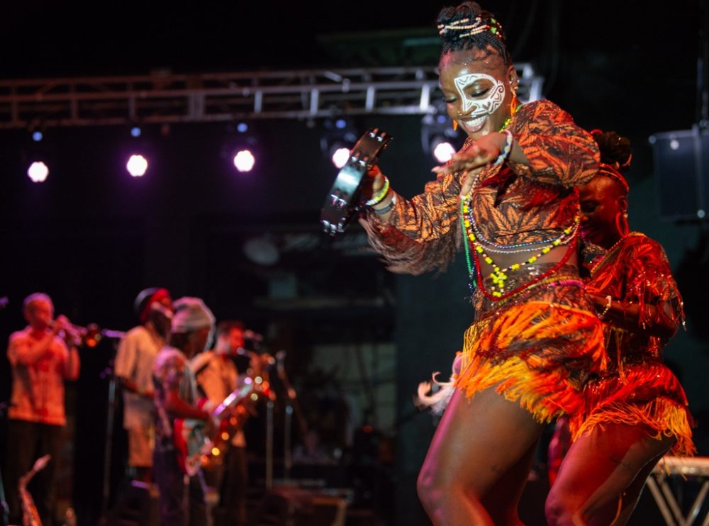 On Saturday, the action moved to The Lena Horne Pavillion for Celebrate Brooklyn with Lollise and Seun Kuti and Egypt 80. Lollise co-hosted and co-produced APWW’s Botswana Dumelang, along with producer Morgan Greenstreet, who is also now her excellent drummer. The two took the big stage alone with just two pink air dancers as foils. The dancers were invented by a Trinidadian Carnival designer Peter Minshall! and Lollise hand painted them. Later two human dancers joined, but it was really a showcase of unusual Afro-rhythms and Lollise’s rich, confident voice. An art show with a beat. The group was also joined by keyboard player Elenna Canlas on synths, vocals and percussion for three songs. (I hope the air dancers were compensated. They worked hard.)