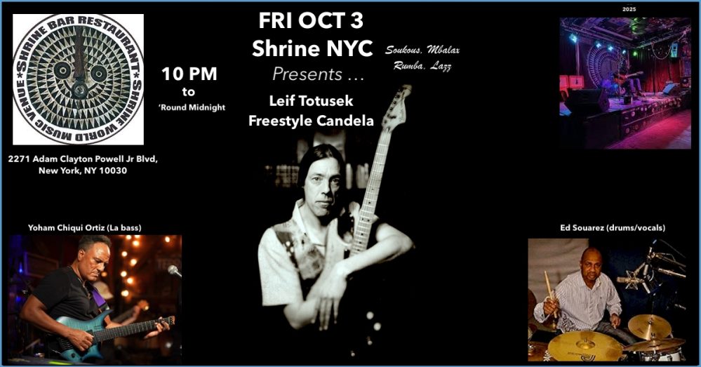 Leif Totusek has spent a lifetime merging the swing and groove of African music styles (soukous, mbalax, mbira and more) with jazz. The Seattle-based maestro makes a rare NYC appearance at The Shrine on October 3. His longtime, ever-morphing band Freestyle Candela plays this time as a trio with Yoham Chiqui Ortiz on bass, and Ed Souarez of Conakry Guinea on drums/vocals.