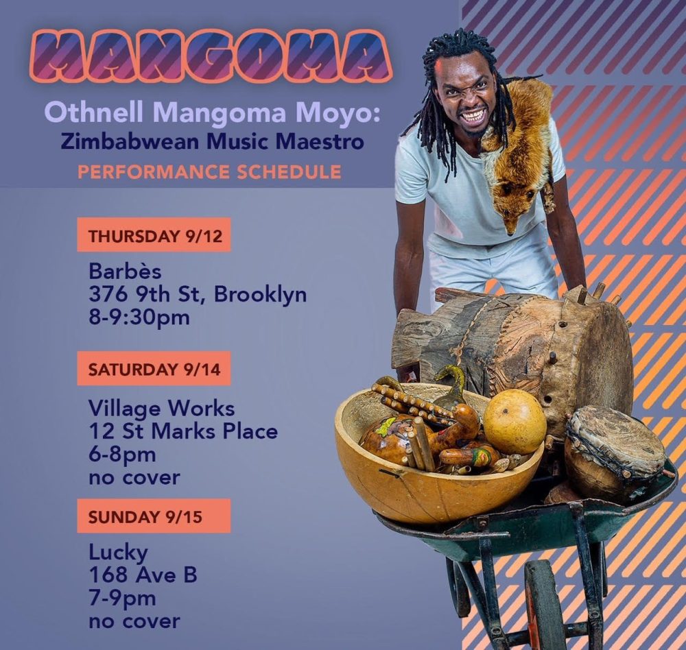 Othnell Mangoma Moyo, a.k.a. Mangoma (“the one with the drums”) is a multi-talented, internationally touring artist, researcher and preservation activist, deeply rooted in Zimbabwean culture. From September 12-15, he will be teaching and performing in New York City, a rare opportunity to encounter the highest level of traditional African music from a master multi-instrumentalist, story-teller and instrument builder.